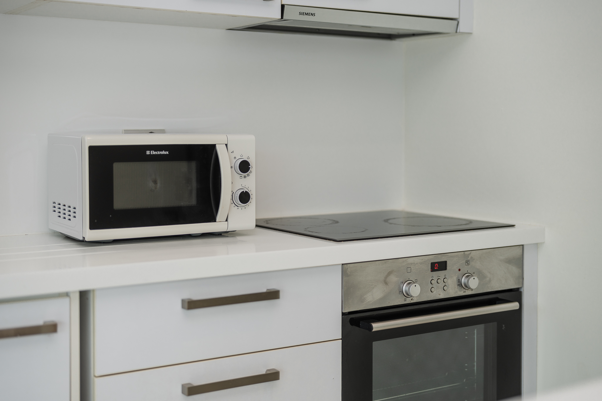 Кухонное оборудование: электроплита, микроволновка, ложка, вилка, тарелка, кастрюля, раковина